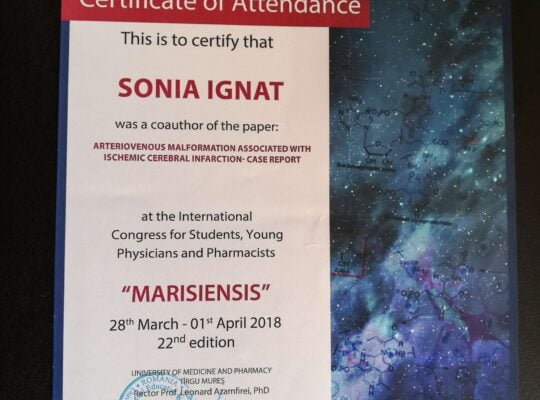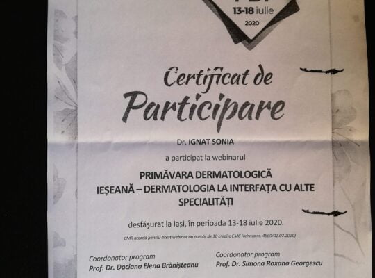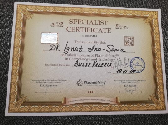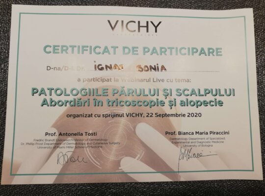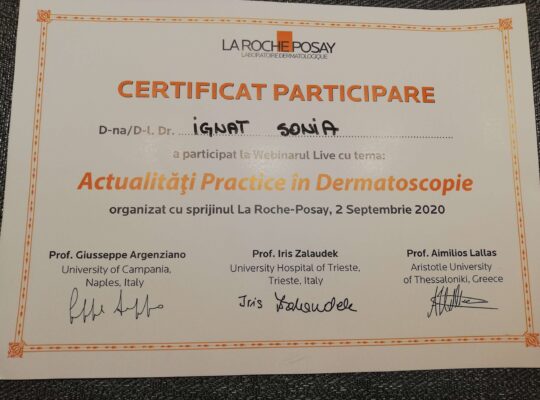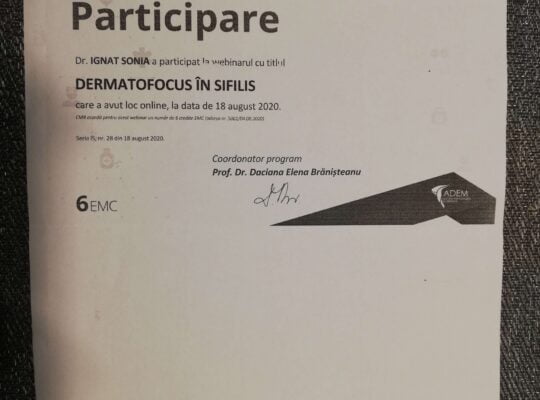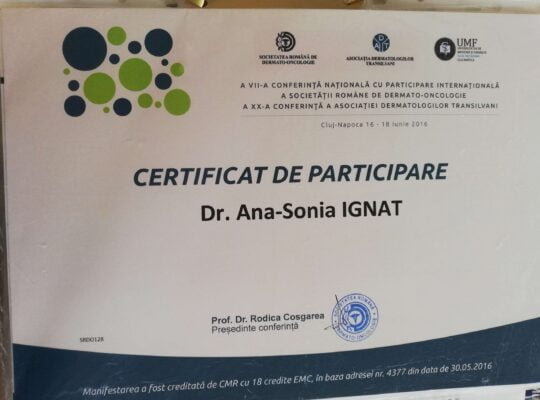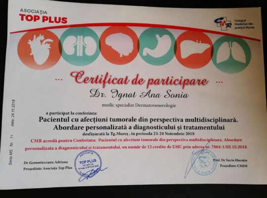 Dr. Ignat  Sonia, medic primar dermato-venerolog, a absolvit Facultatea de Medicină Generală din cadrul Universității de Medicină , Farmacie , Științe și Tehnologie  “George Emil Palade”  din Târgu-Mureș , promoția 2012.