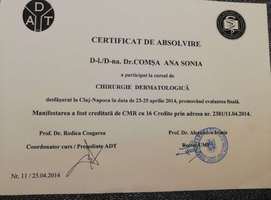 A urmat rezidențiatul în specialitatea Dermato-venerologie, între 2013-2017, cu pregătire atât în cadrul Clinicii de Dermato-Venerologie Târgu-Mureș, cât și în cadrul Clinicii de Dermato-Venerologie Cluj-Napoca.